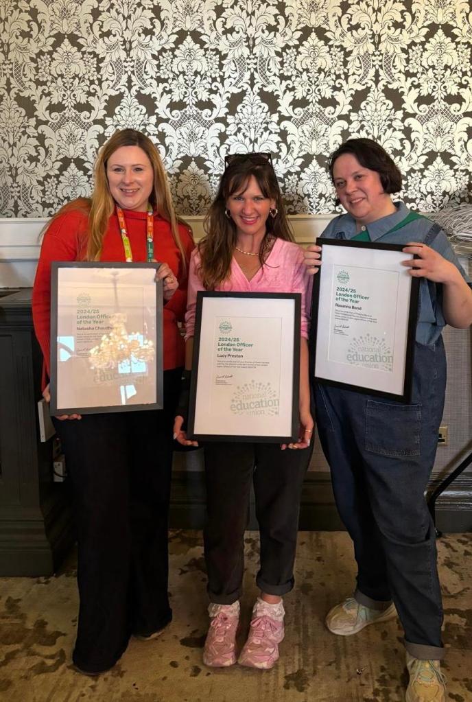 Tower Hamlets & the City sent 9 delegates to Harrogate to represent our district at Annual Conference 2025 this April. We are proud that our delegation was made up of members from all types of schools and from all of the equalities strands. The delegates have the important role of voting on all the motions presented and making sure that our districts needs and concerns are represented in the union’s agenda for next year. Maria, our Independent Schools Officer, gave a passionate speech on the inequalities of the UK’s SEND provision and Rae, our Equalities Officer, spoke on Cuban teacher training practices at the Cuba Fringe. Our SEND Officer Griffiths wrote a report on SEND issues in the union. You can read the report and Maria’s speech here. We are extremely proud that our brilliant, fierce and passionate District and Branch Secretaries Natasha, Lucy and Rosie won the London Officers’ of the Year award.